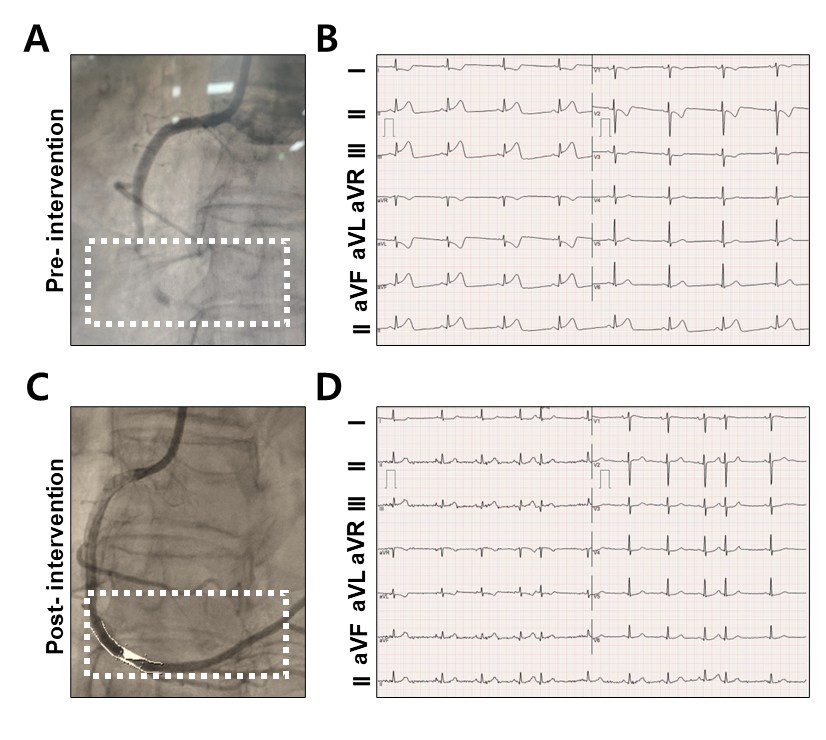 Figure 3. Coronary angiography and Electrocardiogram (ECG) findings before and after intervention. (A) Pre-intervention coronary angiography shows total occlusion of the distal right coronary artery (RCA) within the dotted box. (B) Corresponding 12-lead ECG reveals ST-segment elevation in leads II, III, and aVF, consistent with acute inferior myocardial infarction. (C) Post-intervention angiography after primary percutaneous coronary intervention demonstrates successful reperfusion of the distal RCA with restored TIMI grade 3 flow (dotted box). (D) Follow-up ECG shows resolution of ST-segment elevations in the inferior leads and normalization of QRS morphology, indicating successful myocardial reperfusion