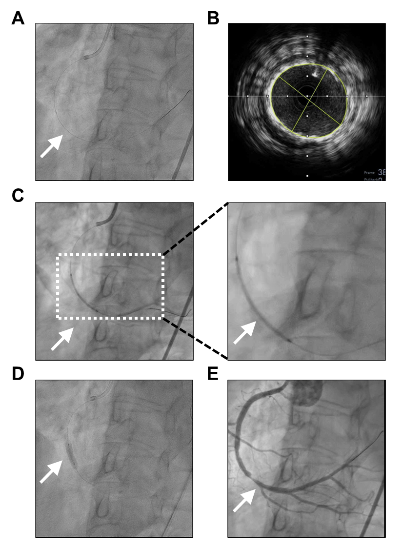 Figure 2. Sequential coronary angiographic images demonstrating the stages of stent deployment in the distal right coronary artery (dRCA). (A) SION blue-intervention image. (B) IVUS image. (C) Stent deployment using a 3.5 × 33 mm drug-eluting stent (white arrow). (D) Balloon inflation during post-dilatation (white arrow). (E) Final angiogram confirming restored 1 flow and well-expanded stent (white arrow).
