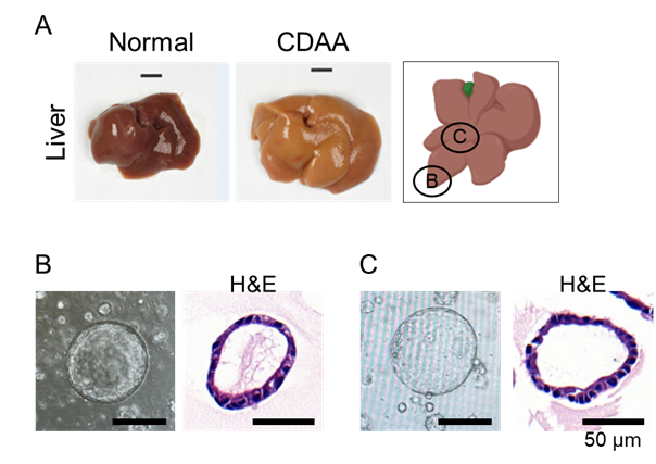 The figure 1 illustrates how liver tissue derived from mice fed a choline-deficient L-amino acid–defined (CDAA) diet exhibits region-specific pathological changes and distinct organoid-forming capacities. Gross liver morphology demonstrates a transition from normal appearance to severe steatosis and fibrotic remodeling after CDAA feeding, reflecting typical features of diet-induced nonalcoholic steatohepatitis (NASH). To evaluate how these pathological changes influence epithelial stem/progenitor behavior, organoids were established from anatomically defined regions of the liver—the peripheral lobe (B) and central parenchymal area adjacent to the portal triad (C). This supports the concept that spatial heterogeneity within the diseased liver profoundly shapes progenitor cell responses and organoid development.