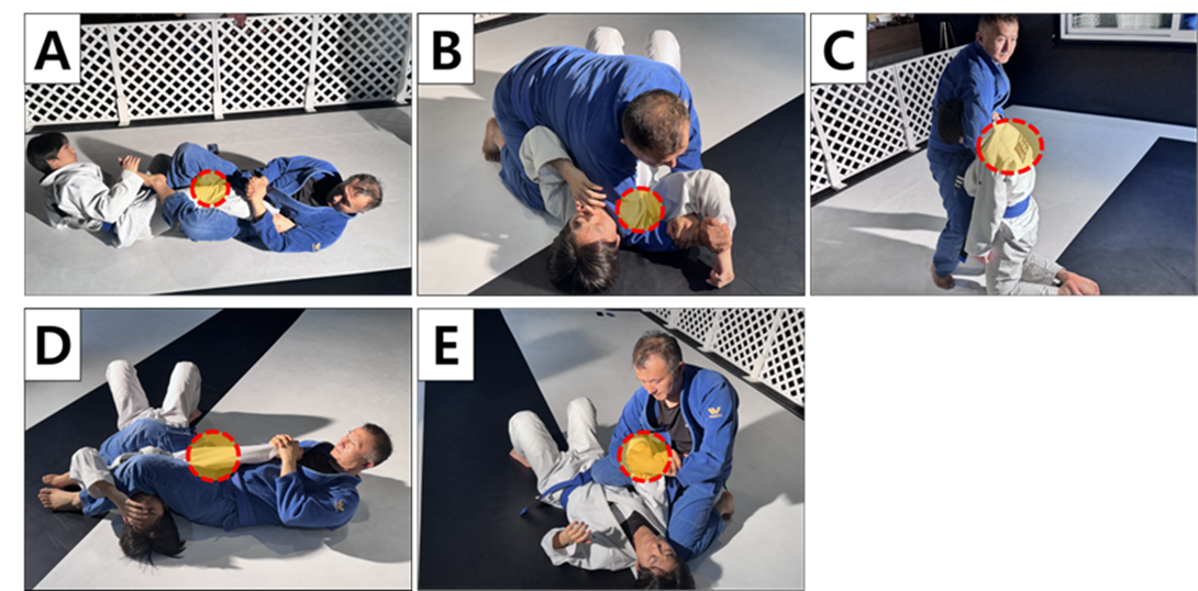 Figure 1. Common Injury Patterns in Brazilian Jiu-Jitsu. Various types of injury patterns are observed, including (A) knee, (B) shoulder, (C) spine, (D) elbow, and (E) fingers and wrists.