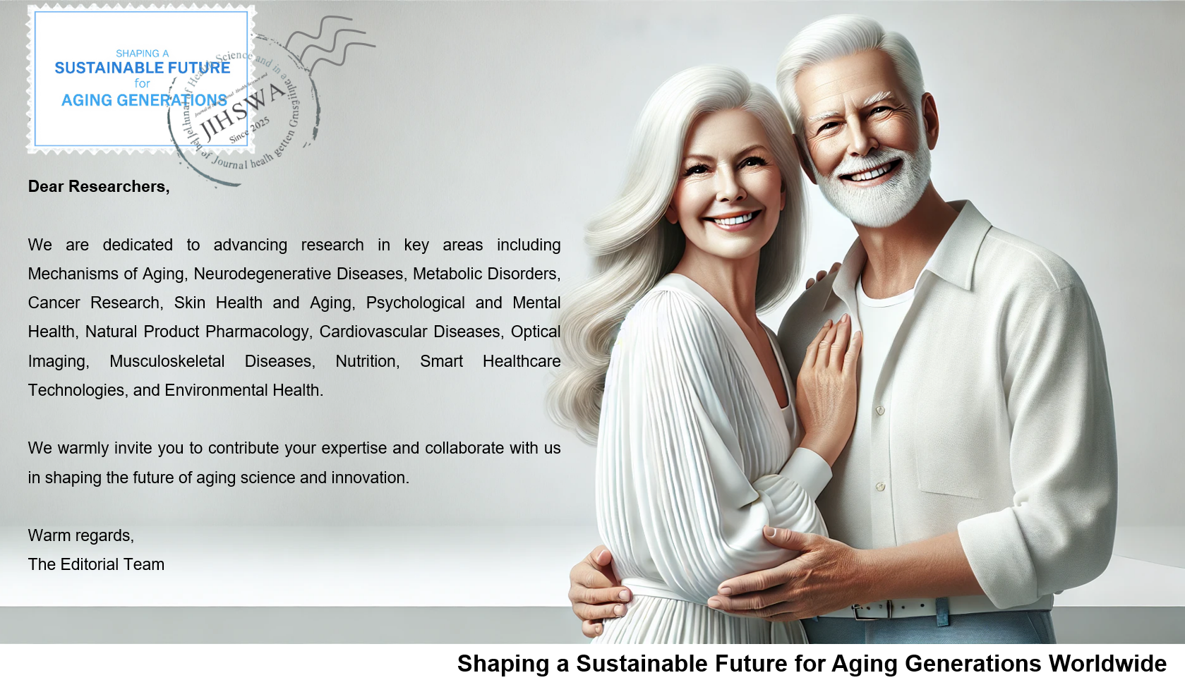 The Journal of International Health Science and Well-Being in Aging (JIHSWA) aims to integrate research on aging mechanisms, neurodegeneration, metabolic diseases, cancer, and skin health into a comprehensive platform. Through collaborative, multidisciplinary approaches, the journal will drive innovations that enhance the health and quality of life for aging populations worldwide.
